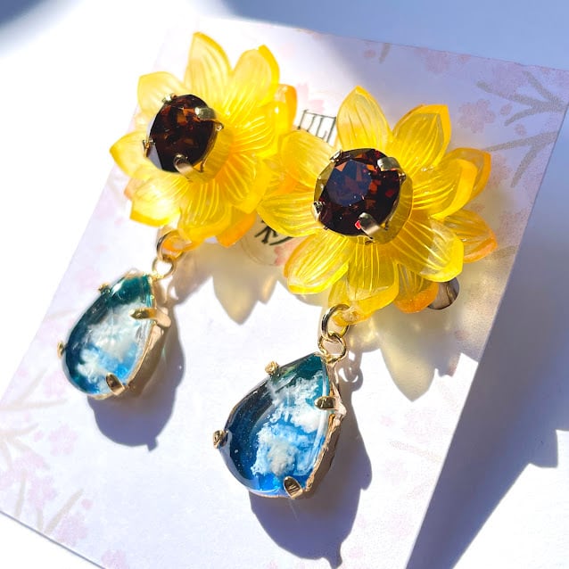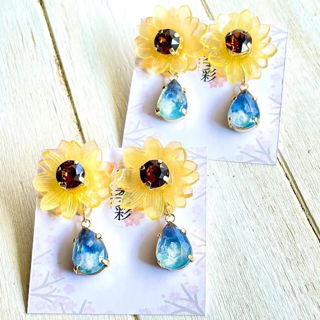 夏の空と向日葵をモチーフにした、透明感あふれるレジンの耳飾りです!