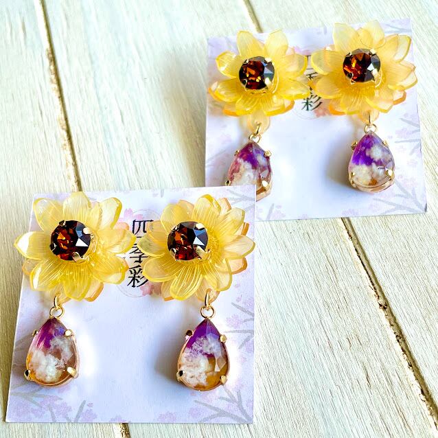 ひまわり鉱石の耳飾り|レジン×プラ板の大きめインパクトアクセサリー